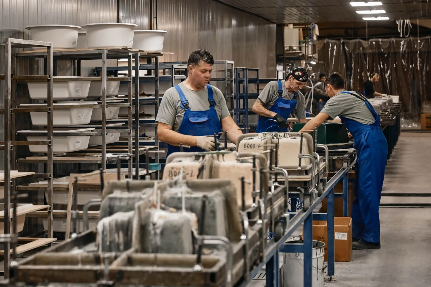 После полимеризации изделия отправляются в цех механической обработки. После фрезеровки кромки и сверления технологических отверстий, изделия поступают на участок комплектации и упаковки.